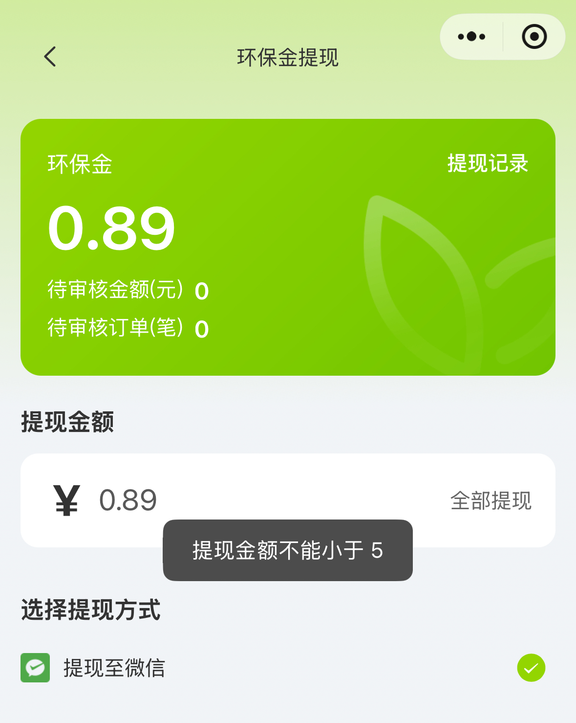 各公司宣称,支持将钱款从小程序提现至微信钱包,但实际操作发现,均存在最低提现门槛。“京环分类”需至少达到0.5元,“爱回收”的提现金额不可小于1元。要求最高的是“e惠收”,提现金额不可小于5元。也就是说,记者在后两家账户中的钱款,还不能转到微信钱包,必须“再接再厉”投入更多物品,直至达到提现额度才行。