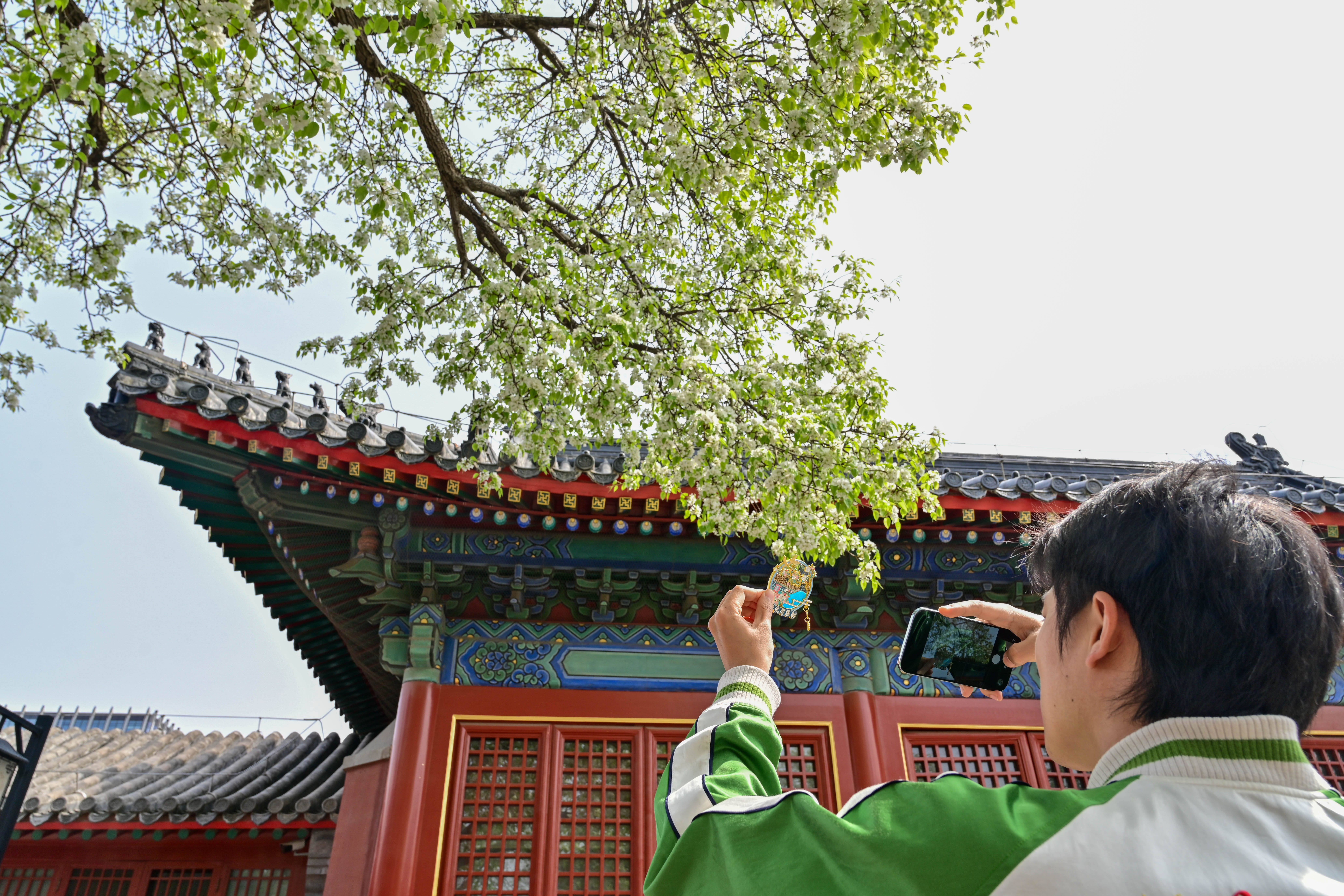 上周末,智化寺智化殿前,梨花树下“长”满了人。观众举着手机、相机,卡角度出片。有些人甚至等不及修图,就发朋友圈炫耀。摄影爱好者张先生说:“我早上8点多就来排队了,就为了赶第一批入馆。”