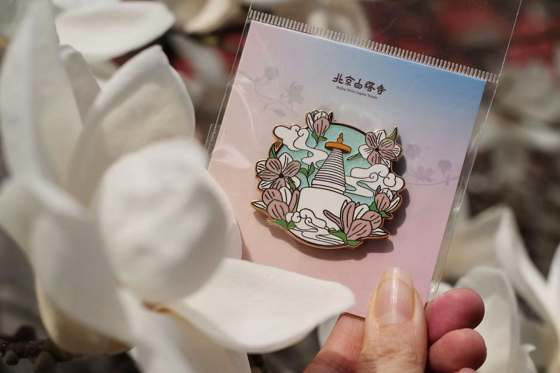 紧跟潮流的白塔寺管理处更是一口气儿上新了多款春日文创。该馆副主任顾莹介绍,最火的一款“妙兰盛遂·白塔寺玉兰挂饰”,1:1复刻了一朵白塔下的玉兰花,每个花瓣皆可打开,呈现玉兰由含苞到绽放的舒展姿态。“设计师还给这朵玉兰赋予了文化内涵。挂饰以手工马鞍结为骨,一结一扣,寓意平安牢固、步步顺遂。纯手工编制的玉兰更有质感、更具温度,很多观众购买后会拿着它与白塔、玉兰同框合影。这也是一种博物馆文化的二次传播。”