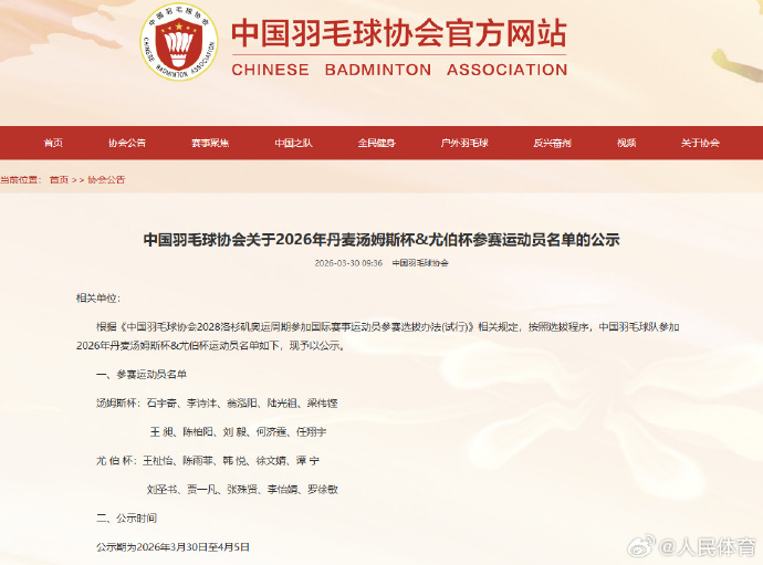 中国羽毛球协会今日发布《2026年丹麦汤姆斯杯&尤伯杯参赛运动员名单的公示》,参赛运动员名单如下: