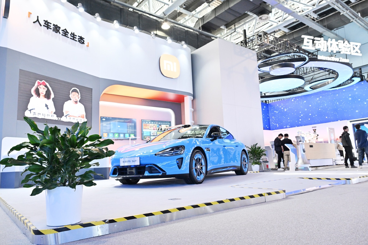 在小米汽车展区,一辆卡布里蓝的小米SU7停在展台上,几位参观者轮流坐进驾驶舱,手指轻触中控屏幕,感受座椅的包裹感。一位刚下车的参观者回头又仔细看看车身,对同伴说:“这颜色真好看,之前在网上看就觉得不错,今天见到实车,确实有点心动。”工作人员笑着接话:“除了配色,这辆车的安全性能也新升级。像车顶和四门的防撞梁都用上了2200兆帕的钢材,这在量产车里算是目前强度很高的了。”