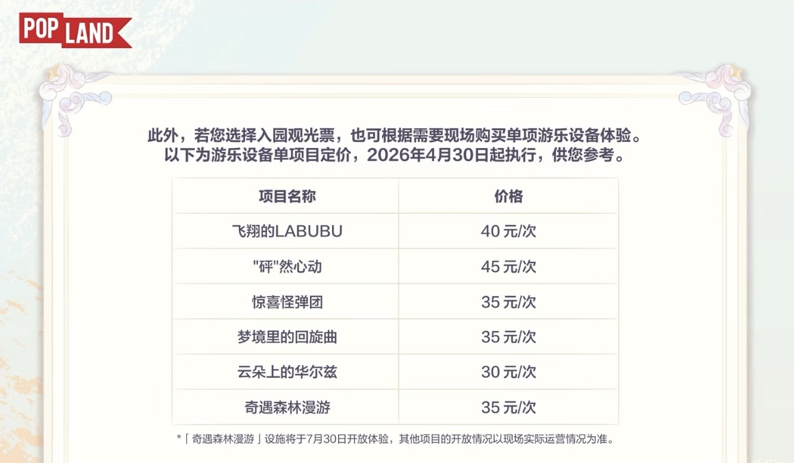 随着1.5期区域即将开放,乐园更新后的游乐设备也首次曝光。新设备包括飞翔的LABUBU、“砰”然心动、惊喜怪弹团、梦境里的回旋曲、云朵上的华尔兹等,单次价格在30元至45元不等。其中“奇遇森林漫游”设施将于7月30日开放体验。