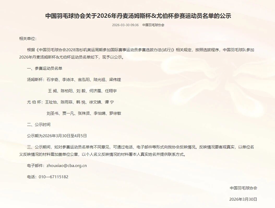 3月30日,中国羽毛球协会官网公示了参加2026年丹麦汤尤杯的中国羽毛球队运动员名单。