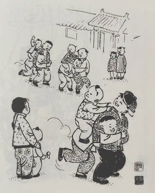 双人骑马:由一个孩子扮演“马”,另一个扮演骑手,骑在“马背”上。游戏时不仅锻炼两个人的身体协调性和平衡能力,更能培养合作和沟通能力。孩子们通过模仿马嘶鸣的声音、马儿奔跑的姿态,仿佛畅游在广阔的天地之间。二人轮换当“马”,次数不限,谁当“马”坚持不住了为输。有时游戏者还设“赌注”,输者让赢者弹几下脑门,不许耍赖。