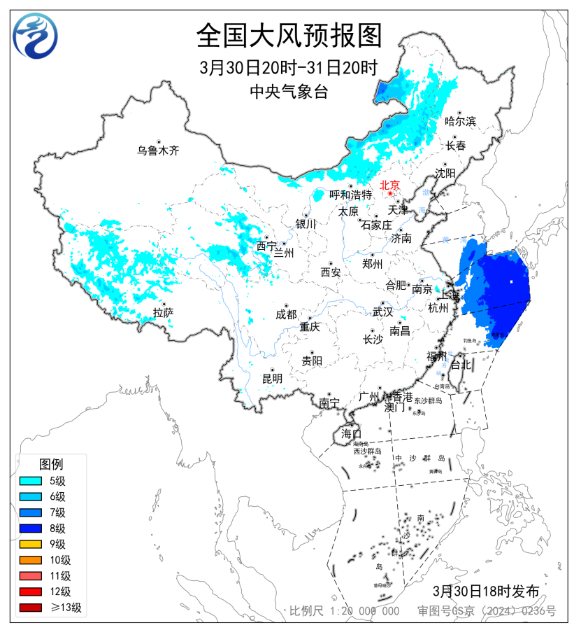预计,3月30日20时至31日20时,西藏西部和北部、青海东部、内蒙古中东部、黑龙江西部等地部分地区有5~6级风、阵风7~8级;黄海东南部海域、东海东部海域将有7~8级、阵风9级的大风。