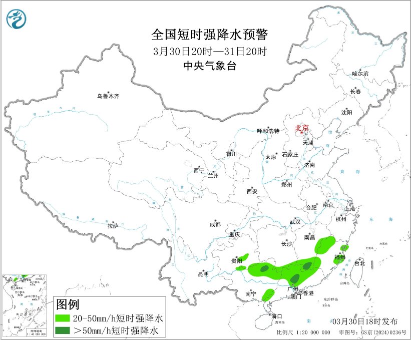 预计3月30日20时至31日20时,西南地区东部、华南中北部、江南南部等地的部分地区将有8级以上雷暴大风或冰雹天气,其中,江西南部、广西北部、广东北部等地的部分地区将有10级以上雷暴大风,最大风力可达11级以上;西南地区东部、华南中北部、江南南部等地的部分地区将有小时雨量大于20毫米的短时强降水天气,其中,江西南部、广西北部、广东中北部等地的部分地区小时雨量大于50毫米,最大可达60毫米以上。