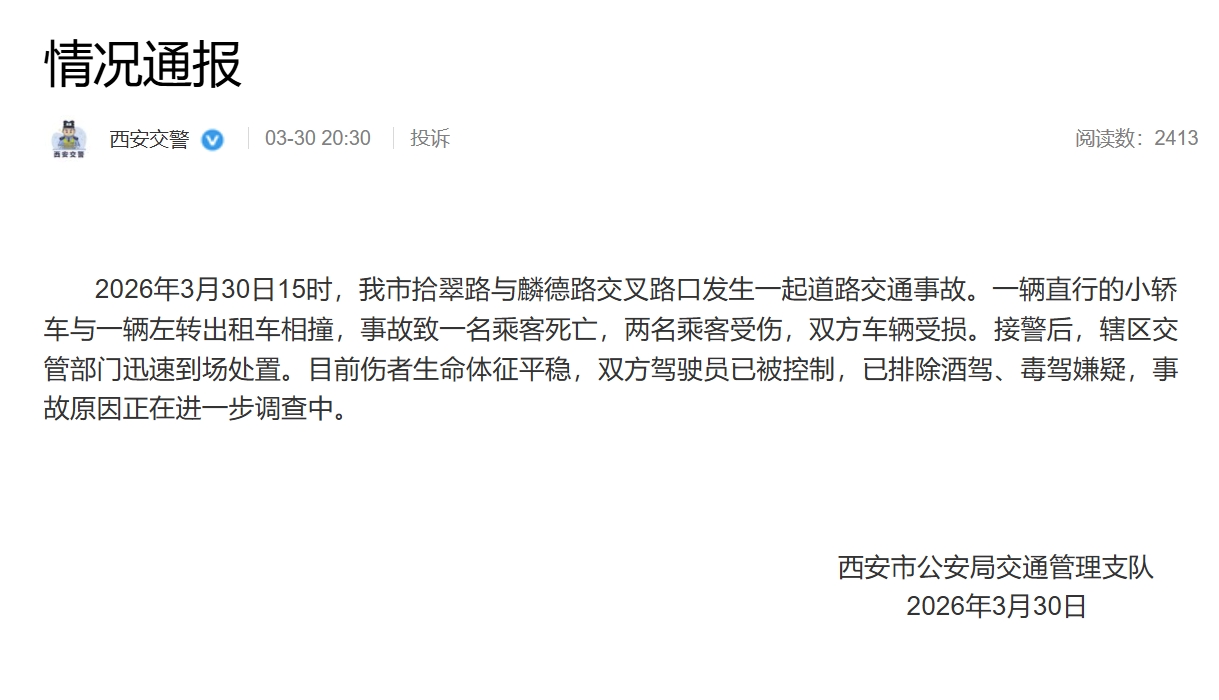 2026年3月30日15时,我市拾翠路与麟德路交叉路口发生一起道路交通事故。一辆直行的小轿车与一辆左转出租车相撞,事故致一名乘客死亡,两名乘客受伤,双方车辆受损。