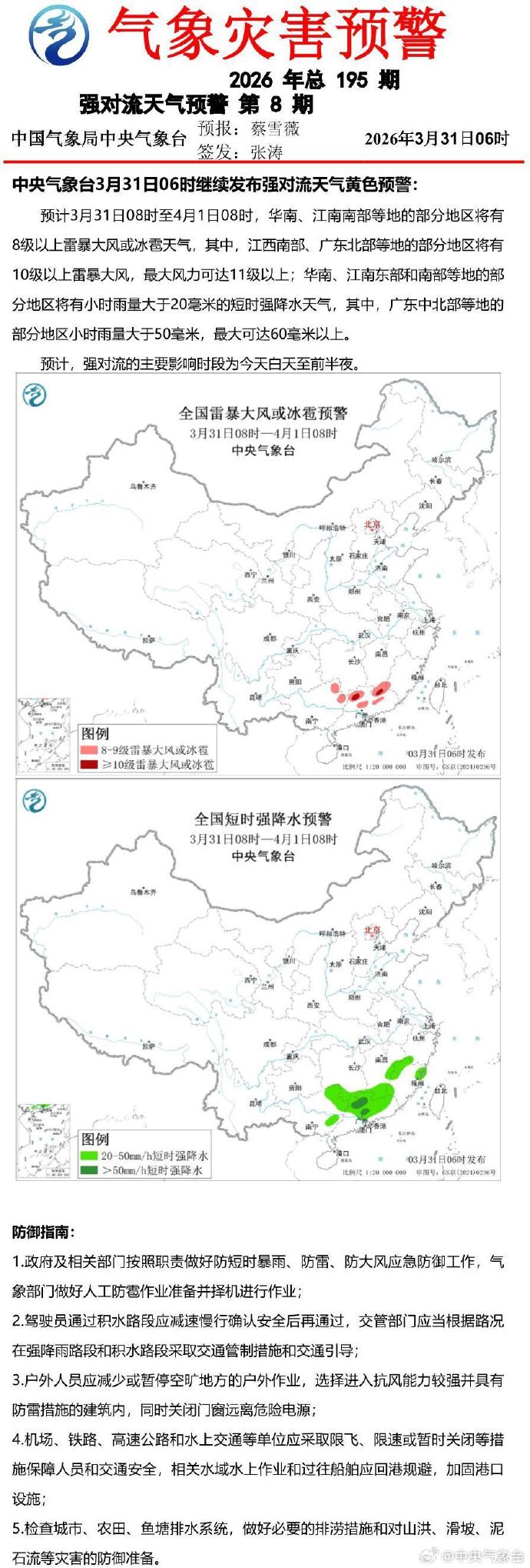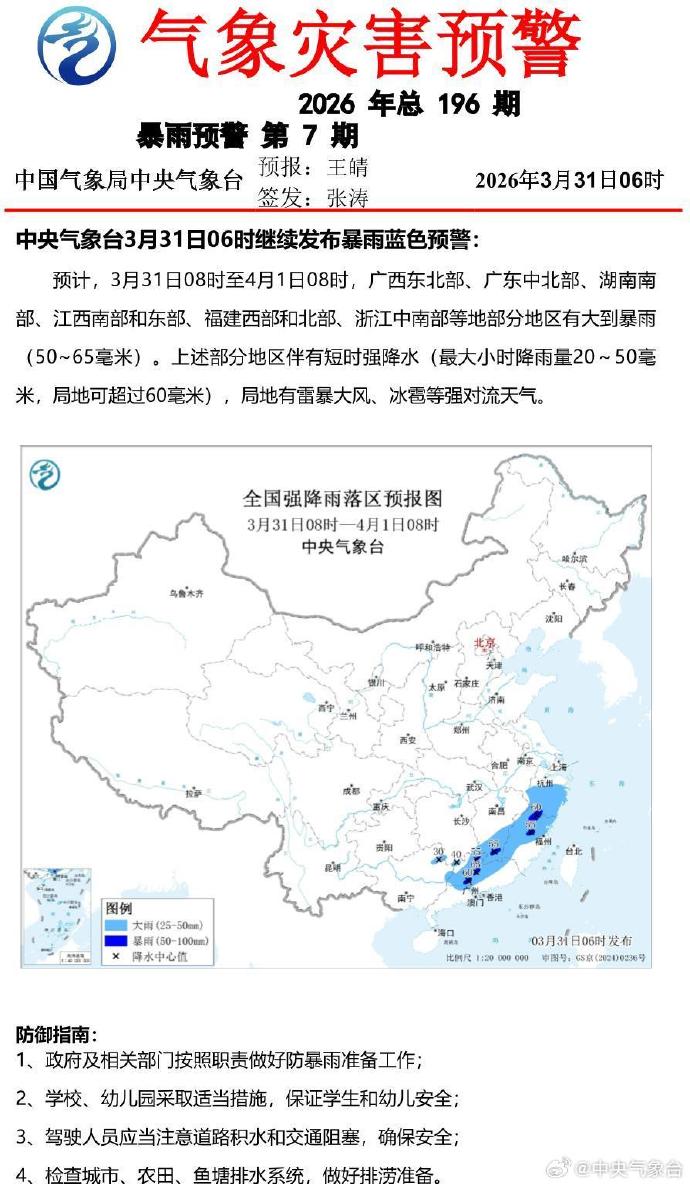 中央气象台3月31日06时继续发布暴雨蓝色预警。