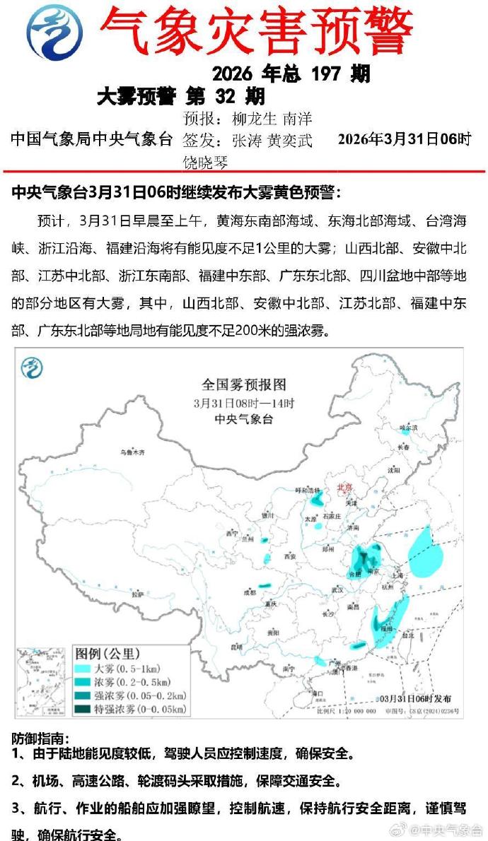 中央气象台3月31日06时继续发布大雾黄色预警。