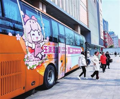 周日上午10点,凯德晶品购物中心南门外,已有十几位市民在有序排队。一辆车身上印有“玉渊潭赏樱专列”字样的大巴缓缓停靠,乘客们依次上车,约10分钟后,便直达玉渊潭公园西门。