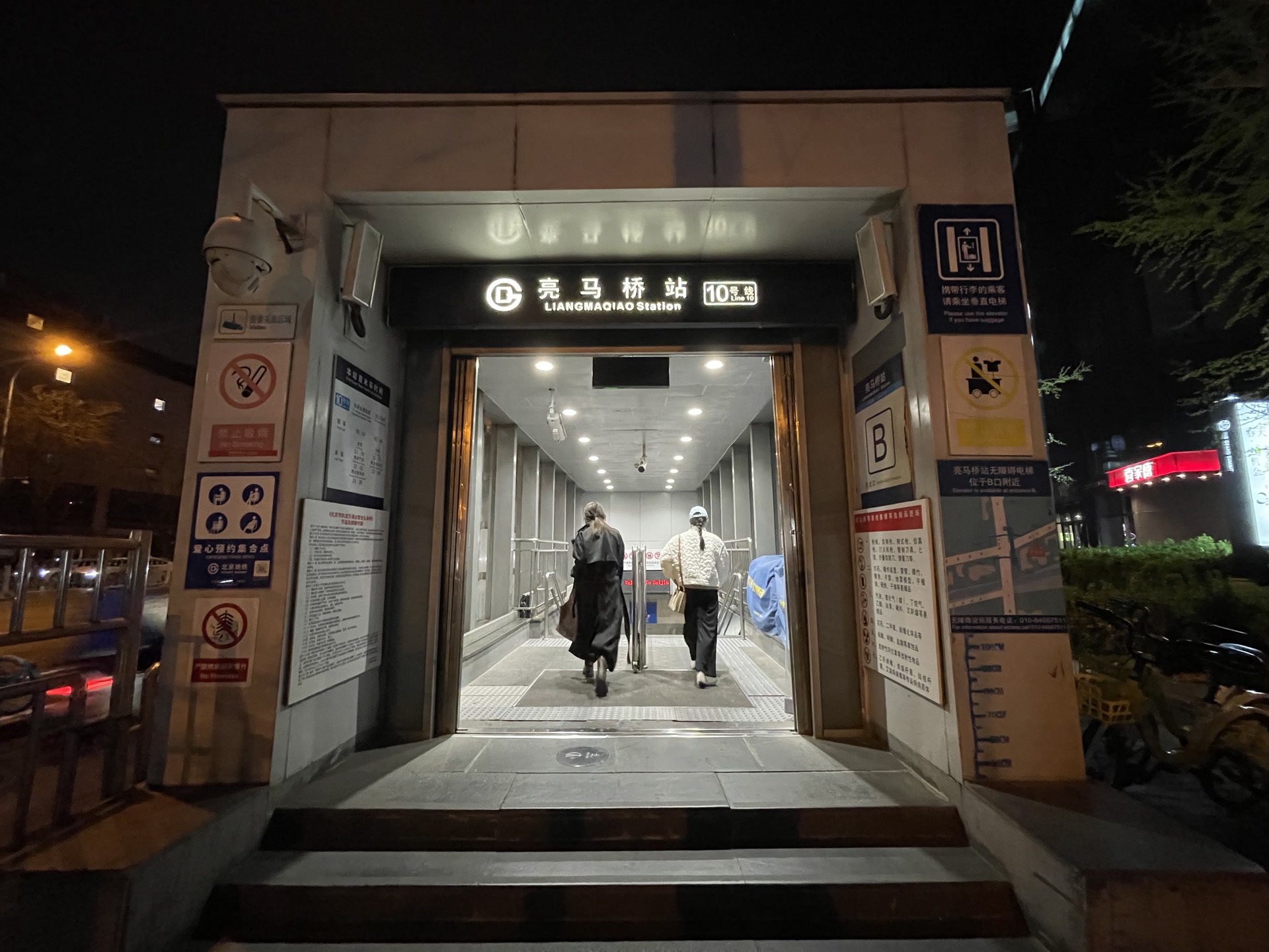 她先是来到马路东侧一个地铁口,发现同样只有上行扶梯;折返后询问路人,被指向北边较远的地铁口,跑过去查看,仍然只有上行扶梯。几经辗转,她才在马路东侧另一地铁口南侧找到一部直梯。