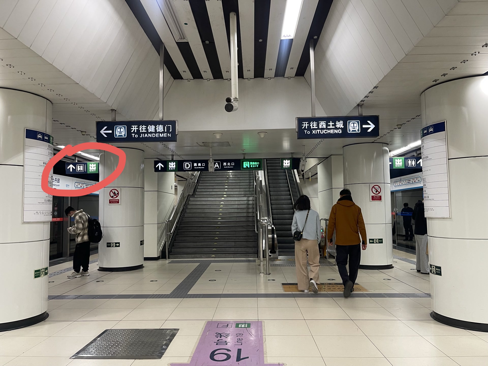 在地铁牡丹园站,10号线换乘19号线可通过换乘三部直梯径直抵达站台,这条路线被常走大兴机场的差旅人士视作行李友好“隐藏路线”。按照网友提示,记者从10号线下车后,沿立柱上的蓝色无障碍电梯标识一路前行,可当走到站台一侧A、D口上行位置时,相关指引却突然中断。视线上方及两侧立柱上不见任何提示,扶梯前地面虽有“携带大件行李请坐直梯”的提醒,却未标明方向。记者停在原地仔细寻找,才在站台左侧立柱斜后方的甬道头顶处,发现了无障碍电梯标识与向内直行的箭头。因有立柱遮挡,极易被忽略。