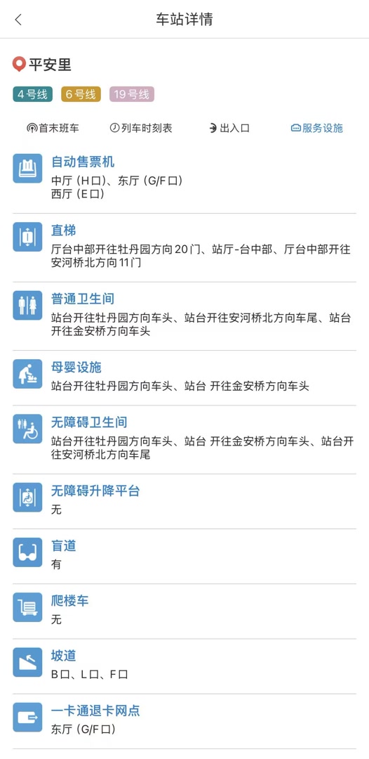 亿通行App为96123北京轨道交通官方App,通过“线路查询”选择地铁站后,在“车站详情”的“无障碍设施”中也可查看无障碍电梯所在的出入口,还可在“车站设施”中查看站内直梯和扶梯分布。