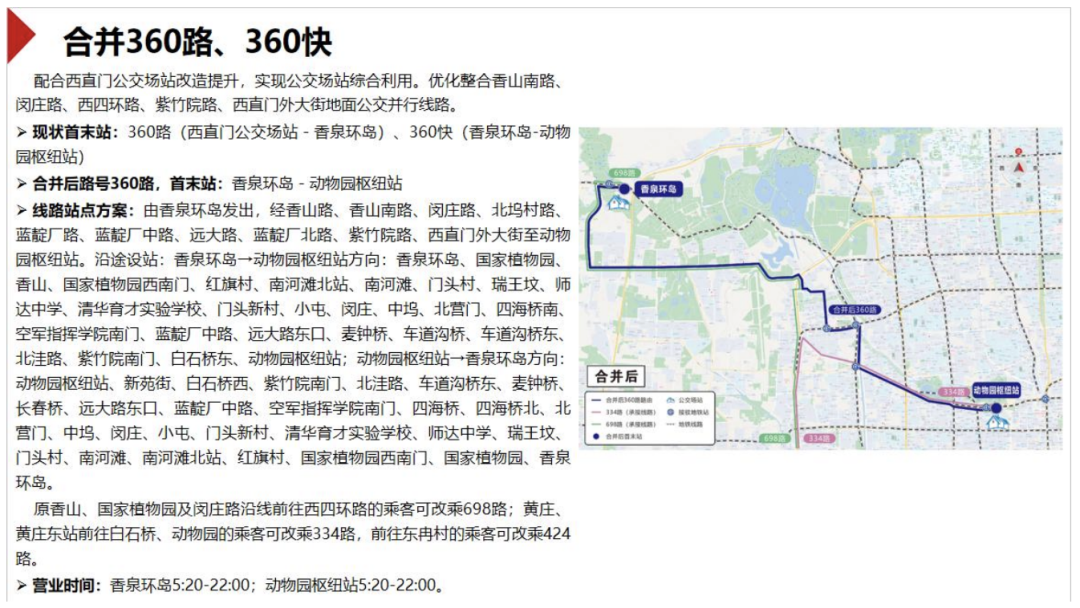 拟合并的还有360路、360快。方案提到,配合西直门公交场站改造提升,实现公交场站综合利用,优化整合香山南路、闵庄路、西四环路、紫竹院路、西直门外大街地面公交并行线路。合并后路号为360路,首末站为香泉环岛至动物园枢纽站。