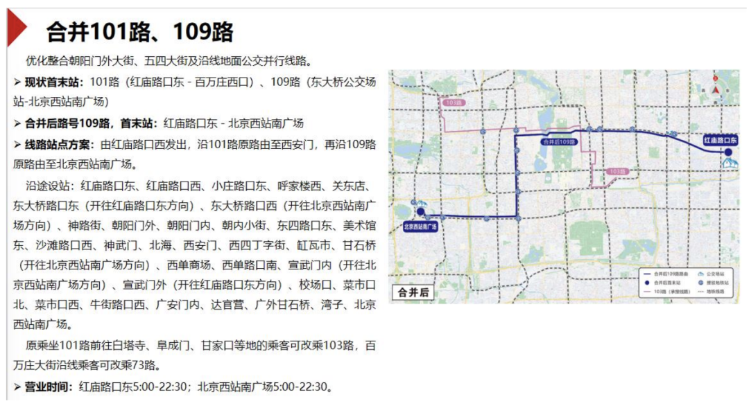 根据方案征求意见稿,拟合并101路、109路,优化整合朝阳门外大街、五四大街及沿线地面公交并行线路,合并后路号为109路,首末站为红庙路口东至北京西站南广场。线路由红庙路口西发出,沿101路原路线至西安门,再沿109路原路线至北京西站南广场。原乘坐101路前往白塔寺、阜成门、甘家口等地的乘客可改乘103路,百万庄大街沿线乘客可改乘73路。
