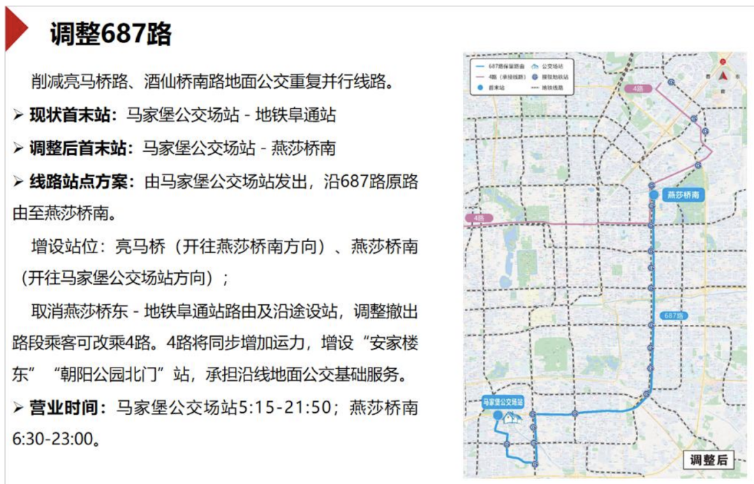 此外,此轮调整拟调整687路,削减亮马桥路、酒仙桥南路地面公交重复并行线路。增设站位:亮马桥(开往燕莎桥南方向)、燕莎桥南(开往马家堡公交场站方向);取消燕莎桥东至地铁阜通站路线及沿途设站,调整撤出路段乘客可改乘4路。4路将同步增加运力,增设“安家楼东”“朝阳公园北门”站,承担沿线地面公交基础服务。