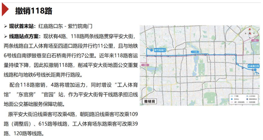 对于计划撤销118路,征求意见稿也给出了说明:目前,4路、118路均贯穿平安大街,两条线路自工人体育场至四道口路段并行约11公里,且与地铁6号线自南锣鼓巷至白石桥南并行约7公里。近年来,118路客运量持续下降,因此该方案拟撤销118路,削减平安大街地面公交重复线路和与地铁6号线长距离并行路段。