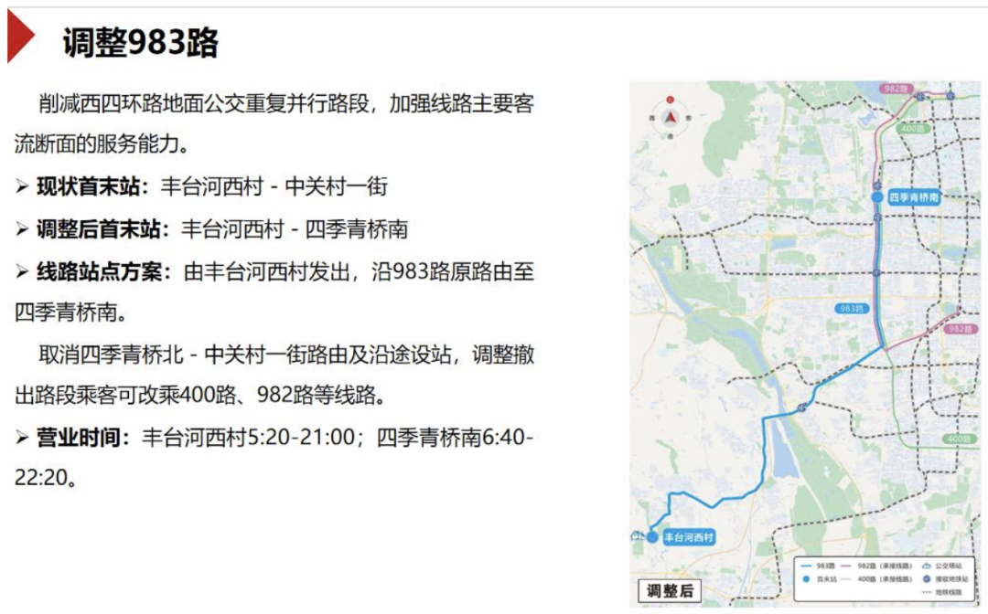 拟调整983路,削减西四环路地面公交重复并行路段,加强线路主要客流断面的服务能力。线路由丰台河西村发出,沿983路原路线至四季青桥南。取消四季青桥北-中关村一街路由及沿途设站,调整撤出路段乘客可改乘400路、982路等线路。