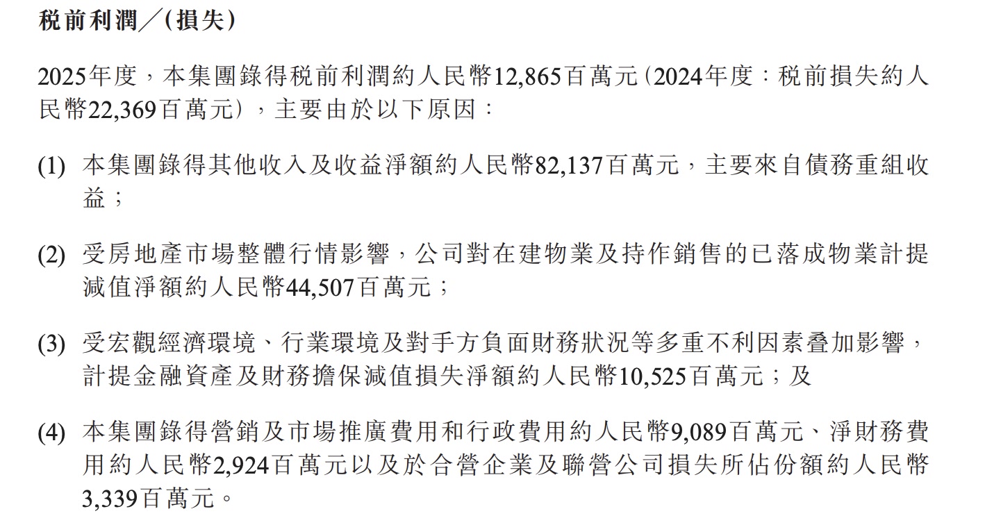 碧桂园在财报中也表示,该公司的其他收入及收益净额约821.3亿元,主要来自债务重组收益,抵消了445.07亿元存货减值、105.25亿元金融资产及财务担保减值损失以及153.52亿元营销费用及净财务费用、合营及联营公司损失。