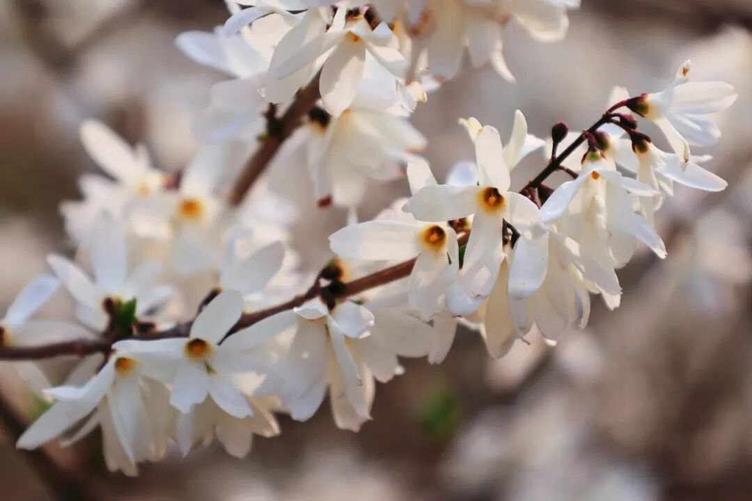 见多了黄色的连翘,还有一种开白色花的“连翘”也十分吸睛,这就是翅果连翘。翅果连翘是木樨科翅果连翘属,与连翘同科不同属,并且枝条花型与连翘都颇为相似,但因花色是白色所以更好分辨。