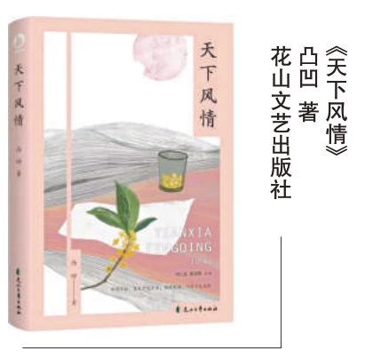 近日,收到友人凸凹快递而来的散文集新作《天下风情》。书的封面设计精细雅致,淡粉色底色上,一只玻璃杯盛着金色桂花,旁侧一页白纸压着桂花折枝,枝条缀满繁花,顶端三片苍叶更添意趣。窗外是无垠黑土地,悬着一轮淡粉色月亮,月角缺了一块,仿若被孩童偷嘴啃去,灵动又诗意。封面下方一行纤细小字——“所谓风俗,是天下之习俗;所谓风情,乃天下之风情”,算是为这本散文集下足了定义。