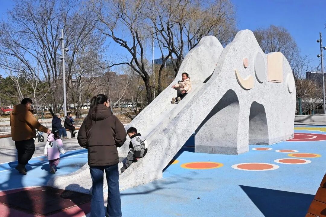 降低滨水步道高差,增设45厘米高舒适台阶、躺椅、垂钓平台等,搭配大象滑梯、卡路里运动公园、林下阅读花园等节点,兼顾老人、儿童、年轻人的休闲需求。