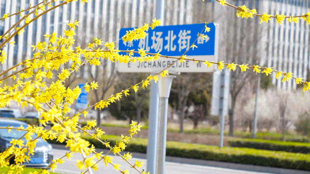 再往机场北路走,风景又不同。这里的连翘与桃花竞相绽放,金黄与粉红交织,色彩更加热烈。