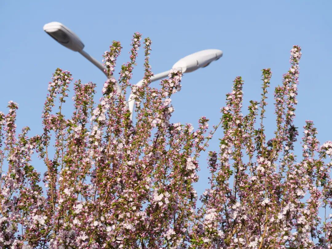 与之呼应的是紫叶李,粉白相间的小花缀满枝头,远望如烟如霞,为这条通往机场的“门户路”平添了几分浪漫与温柔。若是恰逢航班起降,抬头可见飞机掠过花海上空,动静之间,别有意趣。