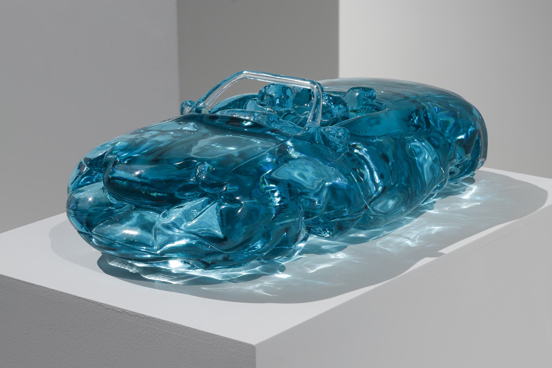 走进展厅,《冰敞篷车》展品格外吸引眼球。艺术家用玻璃打造了一辆敞篷车,晶莹剔透的车身折射出点点光芒。策展人解读:“凑近观察,会发现玻璃表面并非完全光滑,而是带着细微的纹理,仿佛冰面即将融化的瞬间。”作品《脊绿》则用坚硬的玻璃打造植物藤蔓般柔软蜿蜒的形态,使其在光影的流动中透出自然的生机。还有艺术家用玻璃碎片拼接出动物雕塑,锋利的玻璃边缘勾勒出动物毛茸茸的外形,给观众带来强烈的视觉冲击。