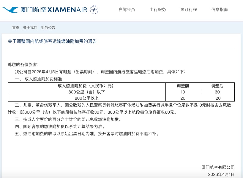继国际航线燃油附加费全面上调后,国内航线燃油附加费也将上涨。4月1日,厦门航空、中国联合航空率先发布消息显示,2026年4月5日0时起(出票时间),国内航线800公里(含)以下航段收取燃油费60元/人,800公里以上航段收取燃油费120元/人。燃油费的收取以原始出票日期为准,换开客票时燃油费不退不补。