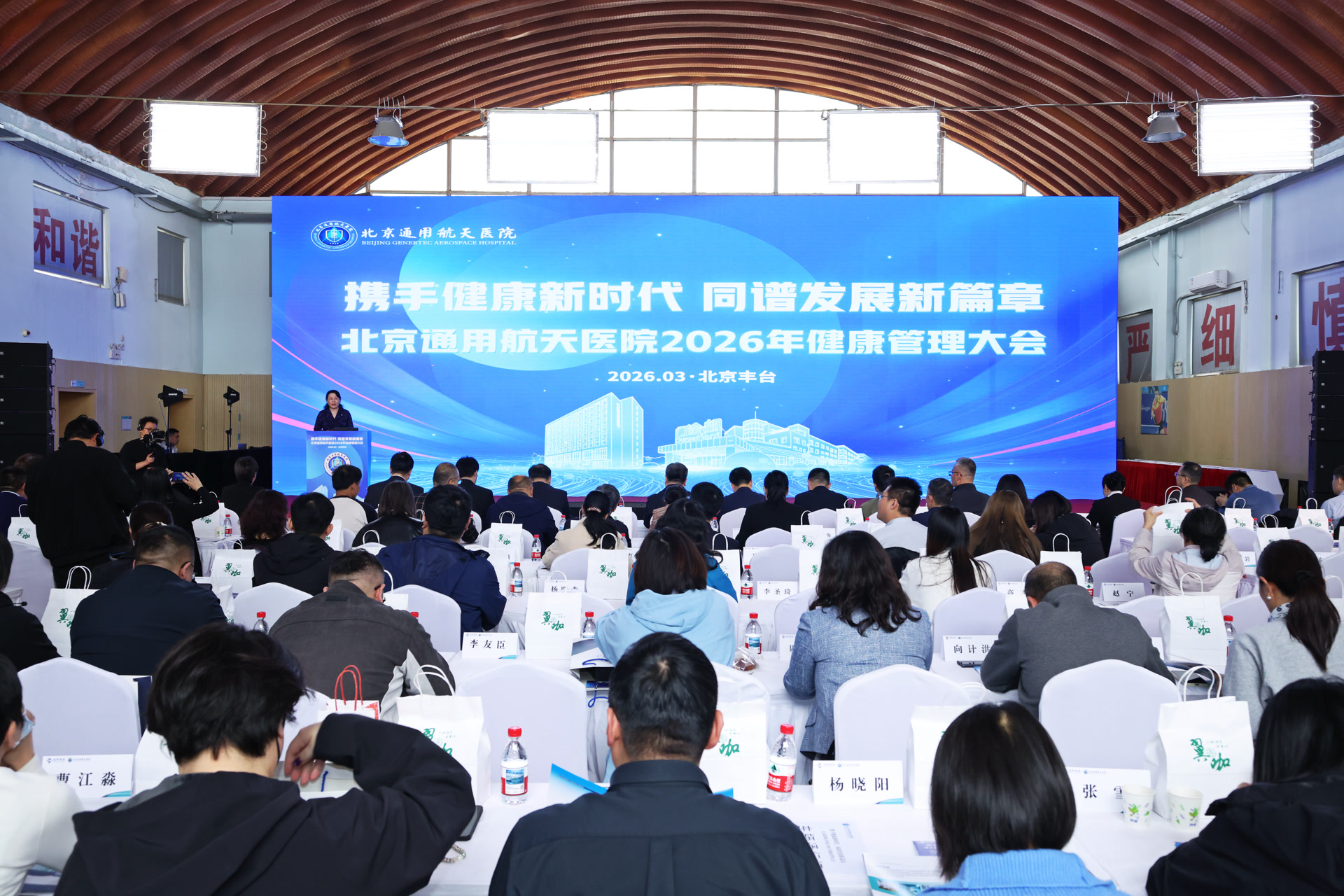 春潮涌动启新程,健康护航向未来。3月27日下午,北京通用航天医院以“携手健康新时代 同谱发展新篇章”为主题举行2026年健康管理大会,中国航天科工三院(以下简称“航天科工三院”)党委委员、总会计师王大伟,航天医疗健康科技集团有限公司(以下简称“航天医科”) 党委委员、副总经理、北京通用航天医院党委书记杨姝雅,通用技术集团医疗健康有限公司党委委员、副总经理杨刚强,全国防控重大慢病创新融合试点项目管委会、高质量职场健康管理先行试点工作委员会秘书长王占山,通用集团及航天系统兄弟单位、各街乡镇、学校、银行、各企事业客户单位的相关负责人、云岗街道的健康指导员齐聚现场,共话健康管理创新发展之路。北京通用航天医院党委副书记、院长尹键主持本次大会。丰台区卫生健康委、北京通用航天医院官方微信视频号全程线上直播,线上观看达5000余人次。
