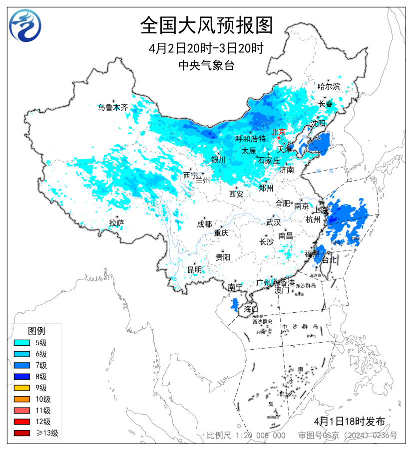 预计,4月2日20时至3日20时,新疆东部、内蒙古大部、西北地区中东部、华北、山东北部、东北地区中南部等地部分地区有4~6级风、阵风7~9级,内蒙古中部、山西北部、河北北部、北京西部等地局地阵风可达10级以上;渤海、渤海海峡、黄海北部海域、东海大部海域、台湾海峡将有7~8级风、阵风9级。