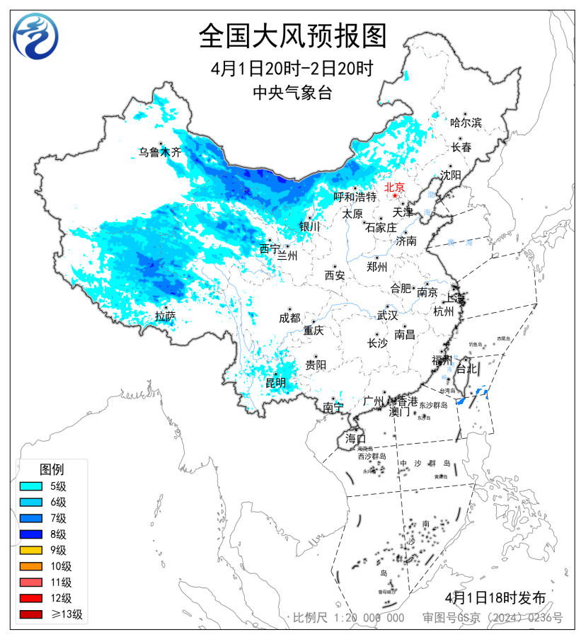预计,4月1日20时至2日20时,新疆东部和南疆盆地、内蒙古大部、甘肃中西部、宁夏北部、青海大部、西藏北部、云南东部等地部分地区有4~6级风、阵风7级,内蒙古中西部、甘肃河西、西藏北部、青海北部等地部分地区有7~8级风、阵风9级。
