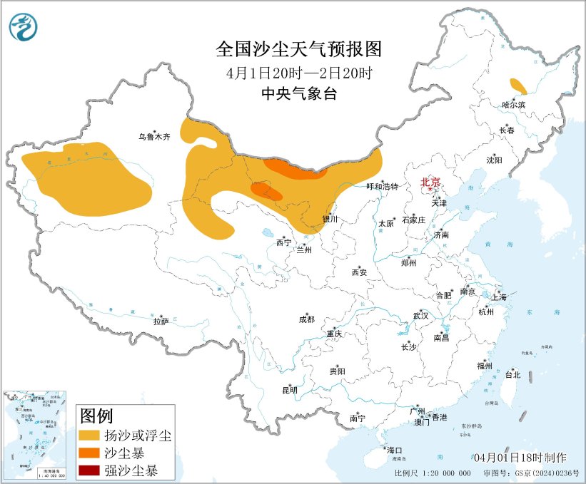 受冷空气大风影响,预计4月1日20时至2日20时,新疆东部和南部、青海西北部、内蒙古西部、甘肃西部、宁夏北部等地的部分地区有扬沙或浮尘天气,其中,内蒙古西部、甘肃西部等地局部有沙尘暴。
