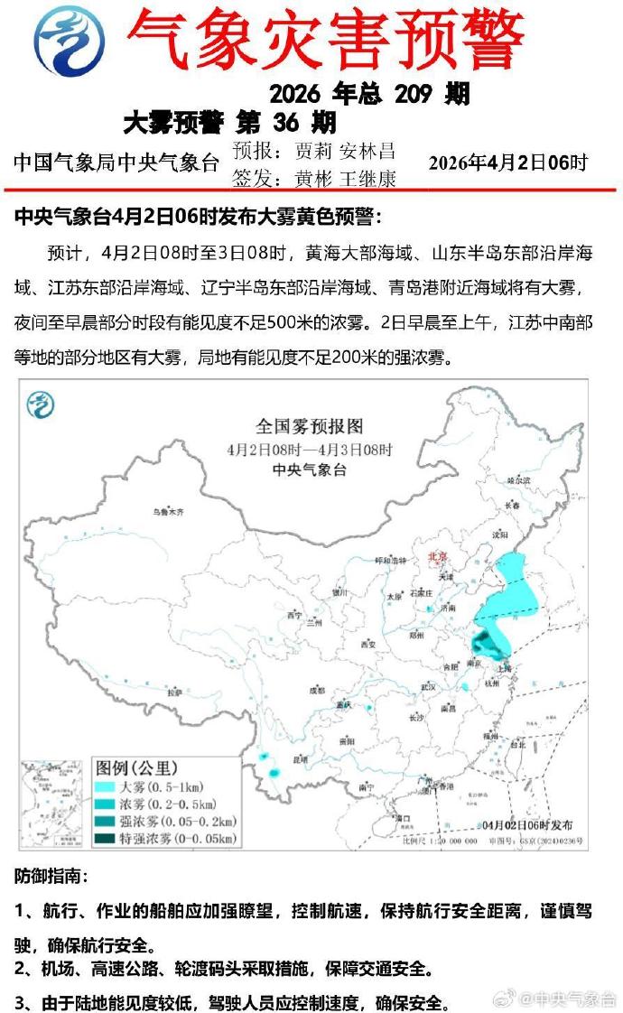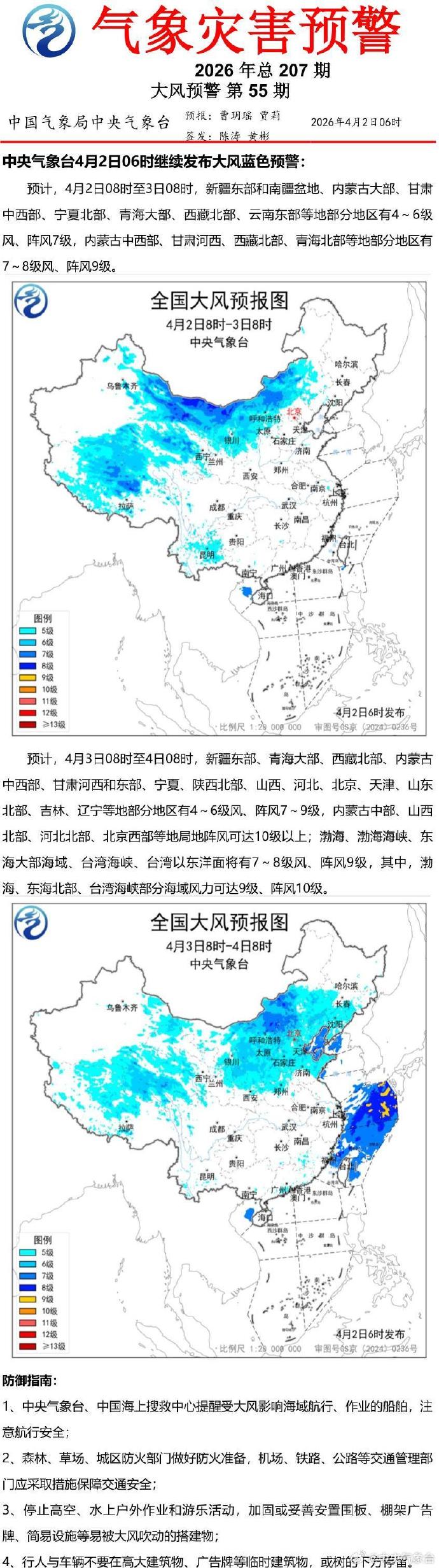 中央气象台4月2日06时继续发布大风蓝色预警。