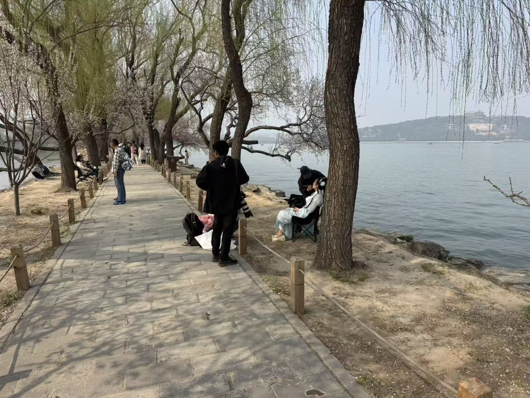 记者沿西堤镜桥向南行,在最经典的“桃柳夹岸”路段,树下的美景被分割成若干“私人领地”。自镜桥至京密引水渠约一公里的道路两侧,分布着6个拍摄团队。记者假借询问价格,和摄影师攀谈起来。“我们店就在颐和园门外,拍摄半个小时带妆造是500元。”摄影师回复说。在练桥旁,摄影师端着相机站在道路西侧,模特在道路东侧摆好造型,非但长时间占着“黄金机位”,还阻碍了道路通行,游客只能等待短暂的拍摄空隙快速穿过。