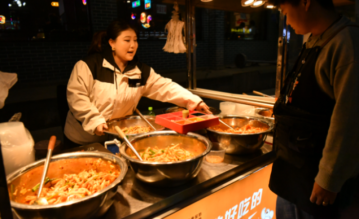 3月31日晚,西宁市城中区大新街夜市烟火升腾,炕锅羊排滋滋作响、酿皮摊前围满食客、新鲜的牛羊肉在烤架上渗出油脂。在这条承载着几代西宁人记忆的老街里,市民游客漫步摊位间,尽情品尝着青海特色美食和小吃,外卖小哥穿梭往来,步履匆匆,将这份美味送往城市的各个角落。