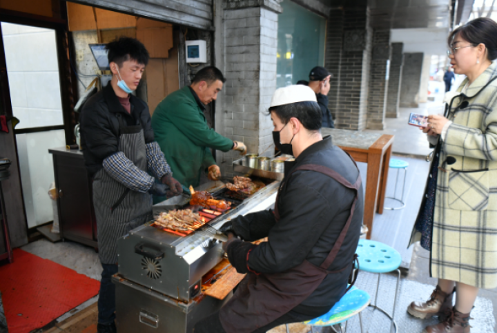 同一时间,城西区兴海路的马一刀烤肉美食城,来自四川的陈闵一家面前摆满了烤牛肉、羊腱子、白斩鸡等本地“硬菜”。“这次就是冲着网上推荐来的,特地尝尝这的烤牛肉。”陈闵边品尝边点头。