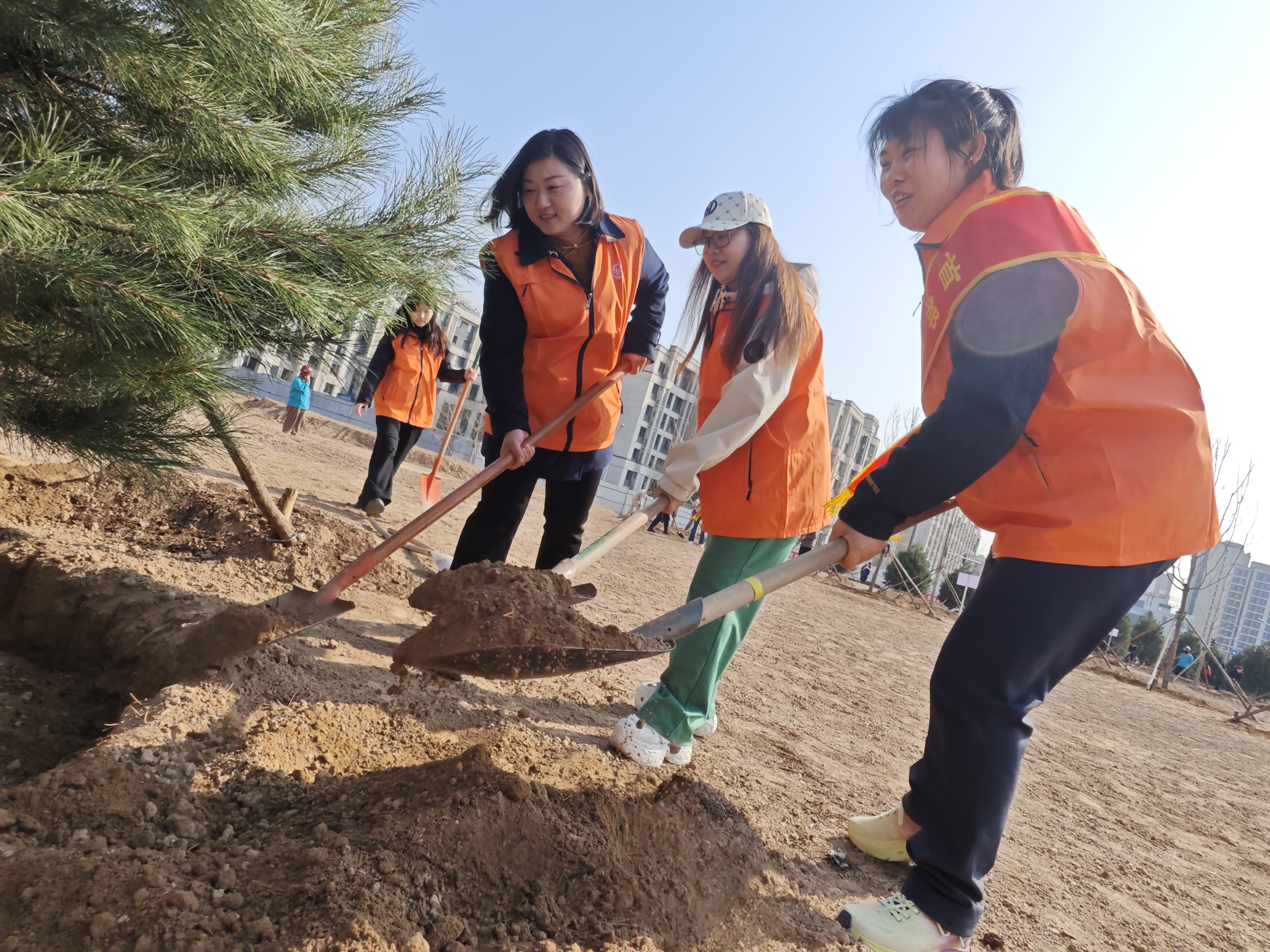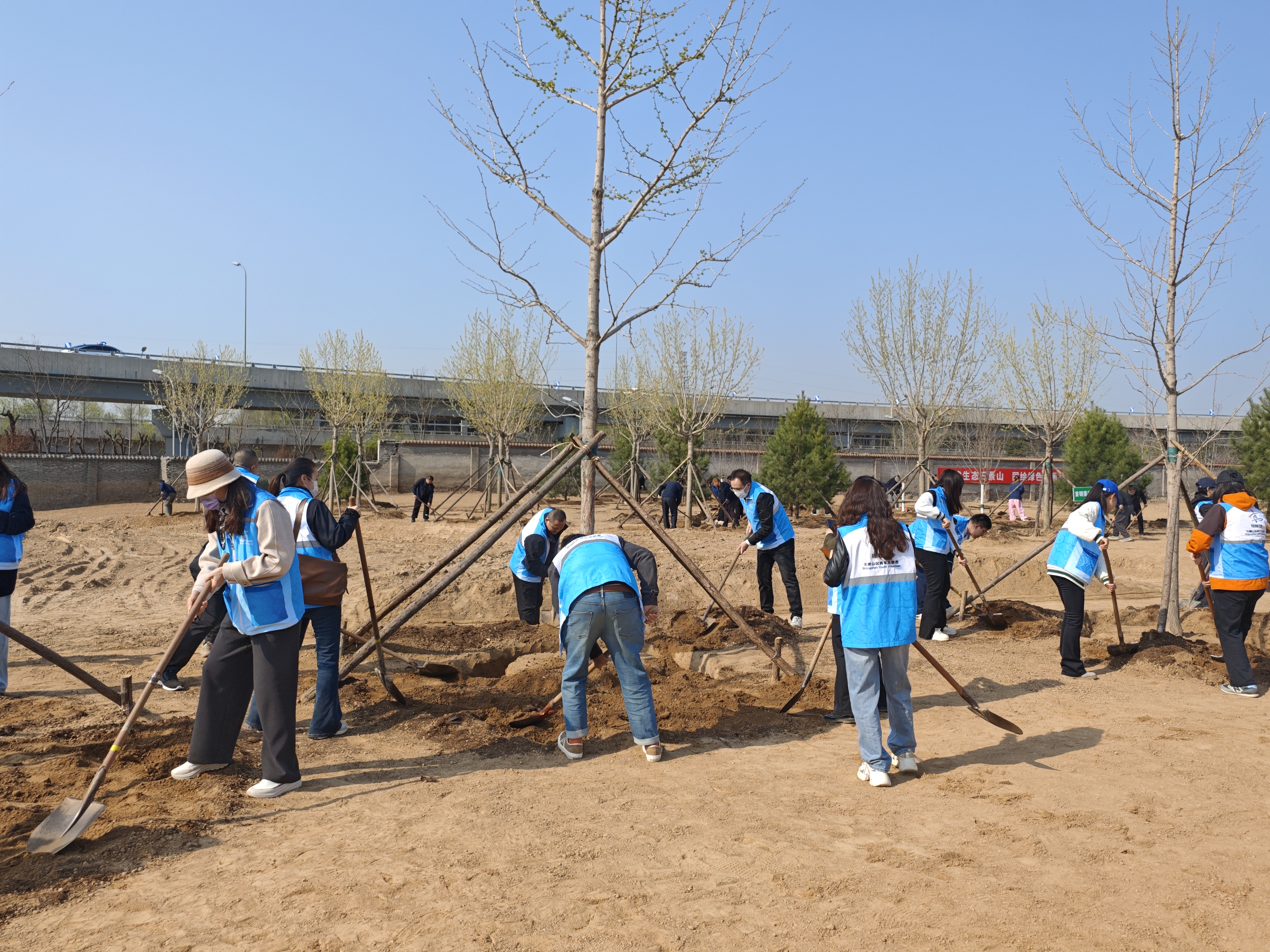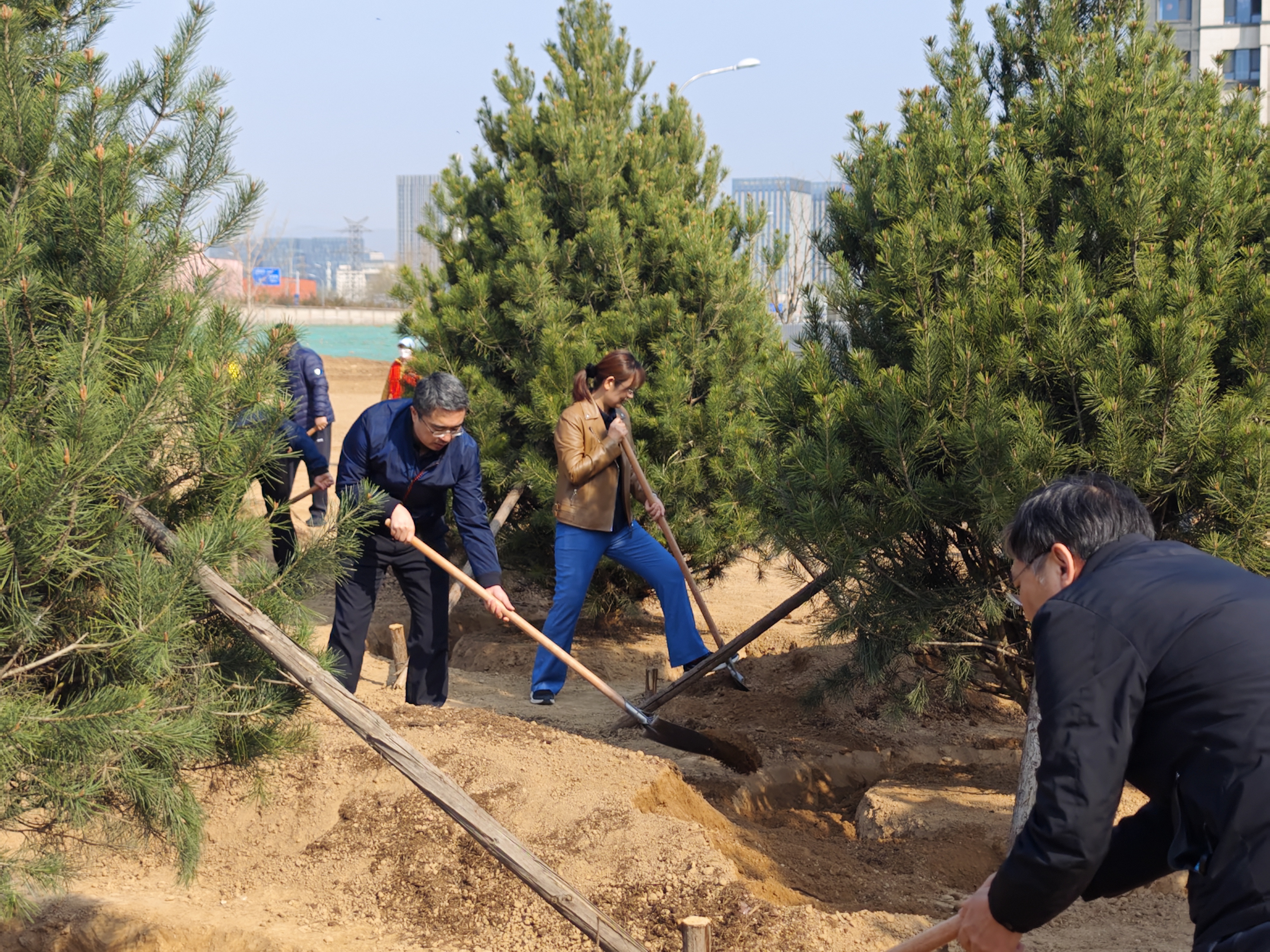 经过辛勤劳作,共栽植白皮松、油松、银杏等苗木100余株。新绿初成,树影婆娑,为未来城市公共空间的建成勾勒出美好图景。