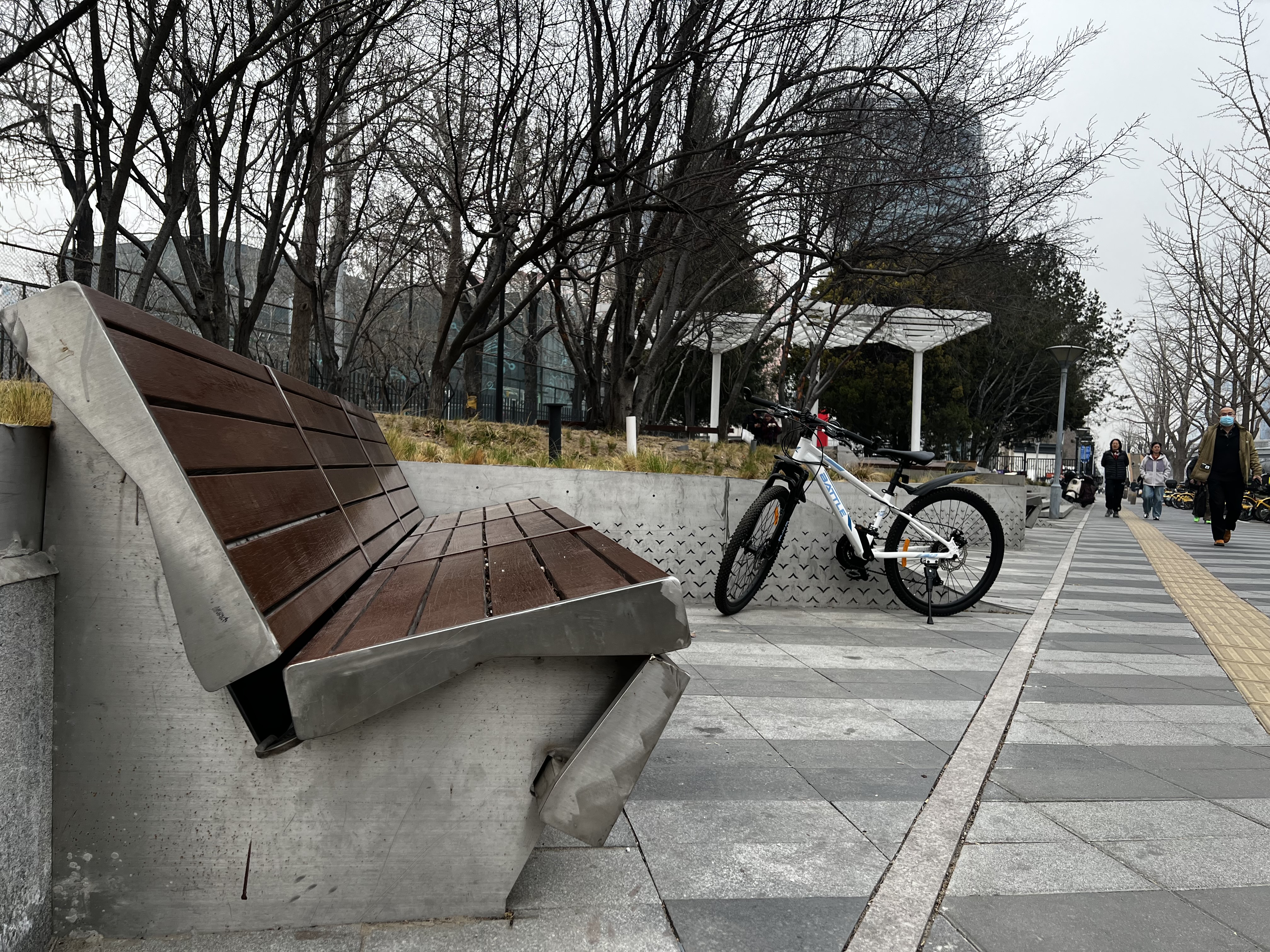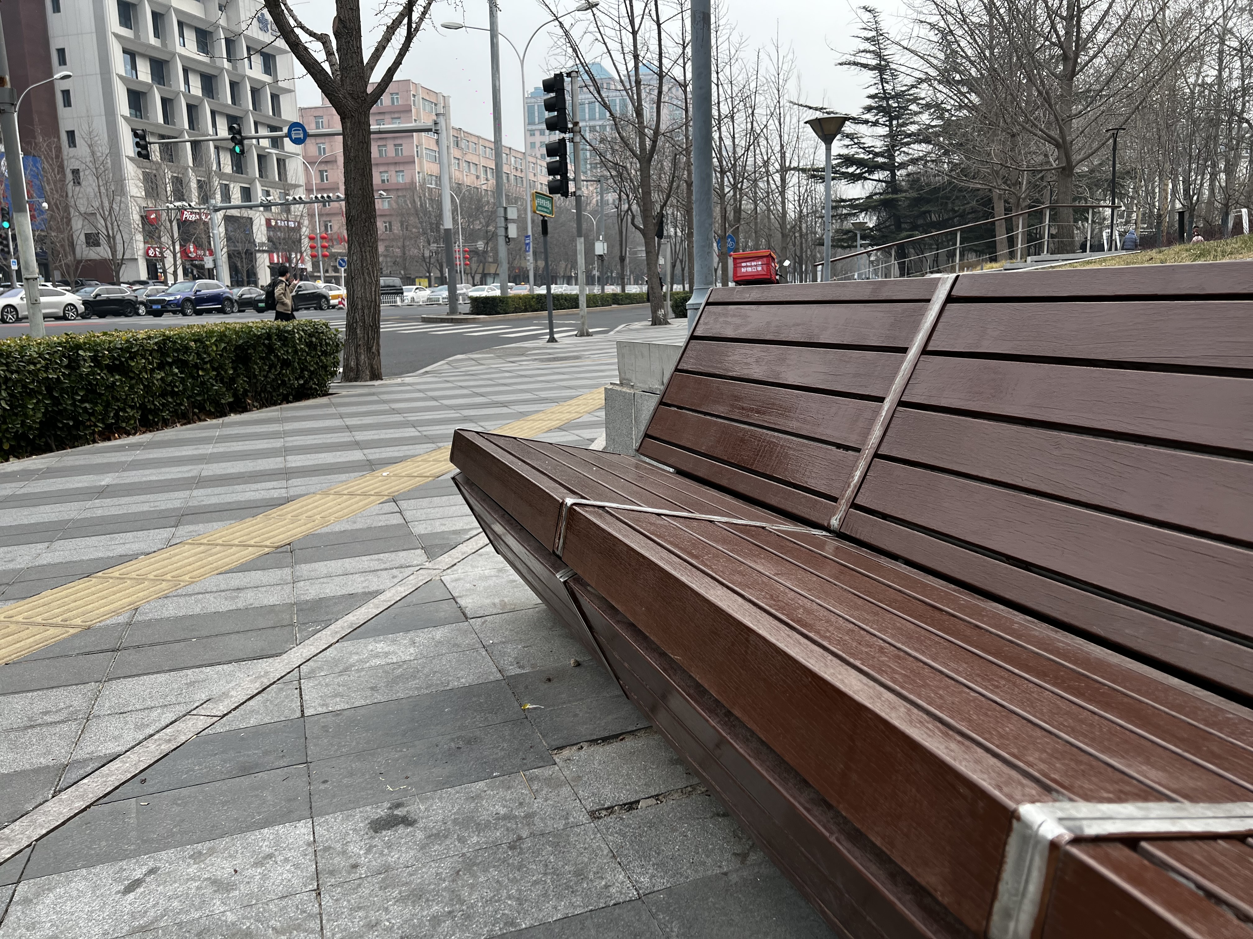 三虎桥北路,一排沿路边绿化带设计的木质座椅人气颇高,不断有路人在此停下脚步休息。一位老人表示,这处椅子的位置很好,唯一的缺点就是座椅的椅背“靠不上”。