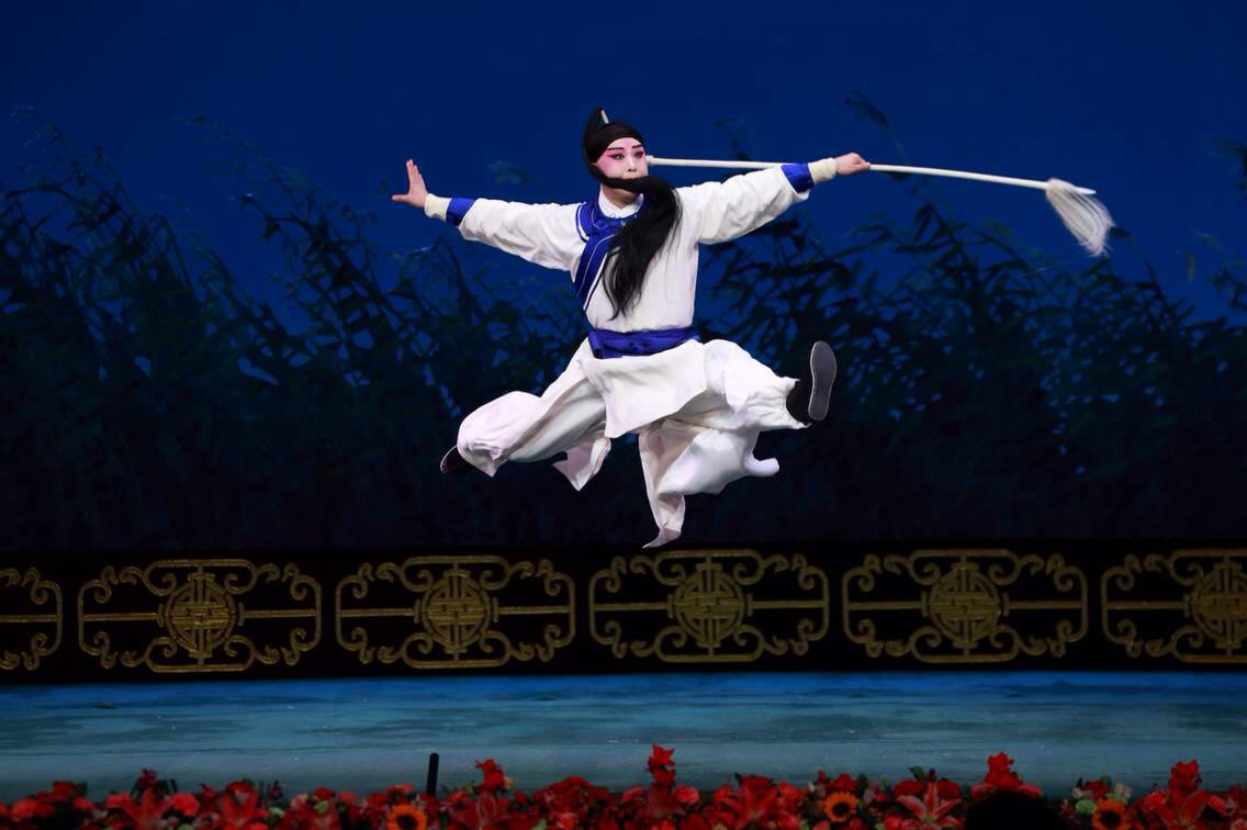 剧末,周瑜在芦花荡口呕血坠马,包飞运用“金鸡独立——鹞子翻身——僵尸倒”的高难技巧,直挺挺向后仰面倒下,干净利落,惊心动魄。那一句临终前的“既生瑜,何生亮”,包飞念得苍凉悲壮,满腔愤懑与英雄末路的无奈尽在其中。此刻的周郎,不再是开场的那个雄姿英发的少年统帅,而是一个被命运与才智双重碾压的悲剧人物。包飞以其精湛的技艺和深厚的人物理解,完成了这一角色的完美塑造——周瑜不是死于气量狭小,而是死于对自身使命的执念与命运弄人的无奈。