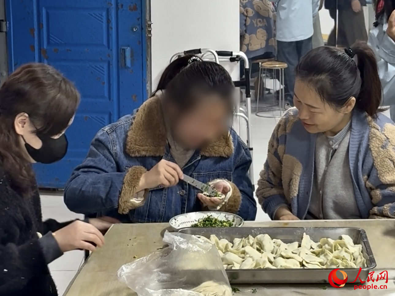 阳光家园位于铁塔寺社区潘家村小区内。小区物业的两名工作人员坐在孤独症青年李妍身边,教她包饺子。起初,李妍低着头,兴致不高,其中一名物业工作人员问她要不要自己包一个,接着将面皮放在她手心。尽管双手颤抖、把握不准力度,她依然完成了所有步骤。“真棒!”大家送上掌声,李妍露出笑容,一边说“要”,一边伸手拿面皮,想要再包一个。