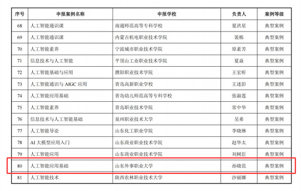 近日,教育部职业院校信息化教学指导委员会正式公示2026年人工智能应用典型案例遴选结果。经专家严格评审,山东外事职业大学人工智能学院孙晓范团队申报的《人工智能应用基础》课程案例,在全国众多职业院校申报项目中脱颖而出,成功入选“人工智能通识课程典型案例”。