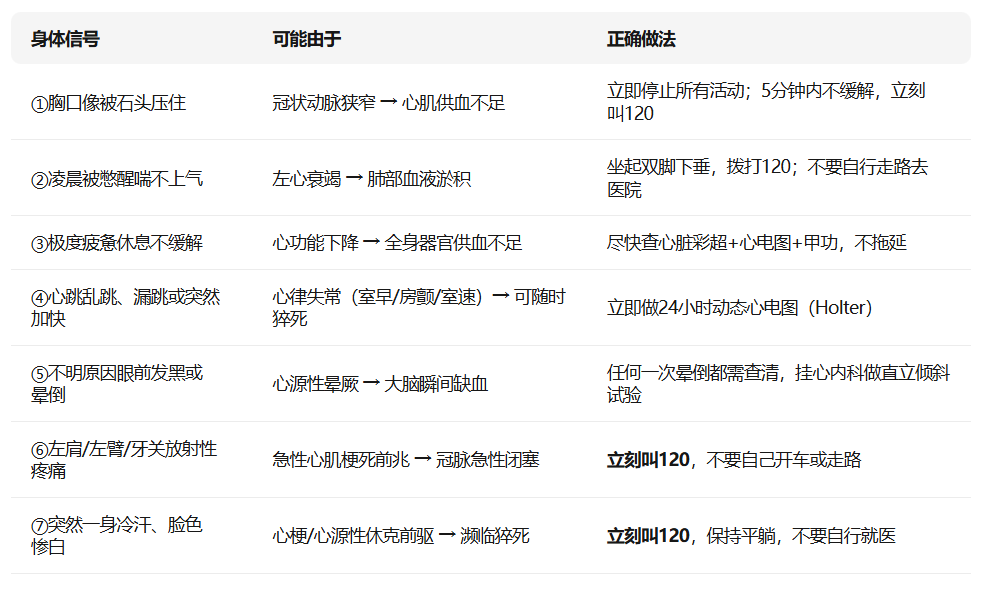 这些信号别忽视:持续莫名的疲惫、新发或加重的胸闷心慌、活动后气短、一过性晕厥或眼前发黑。