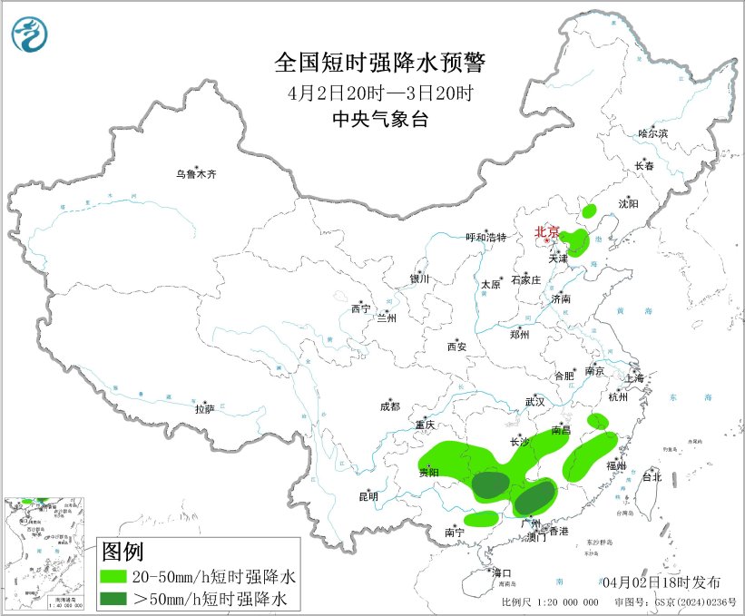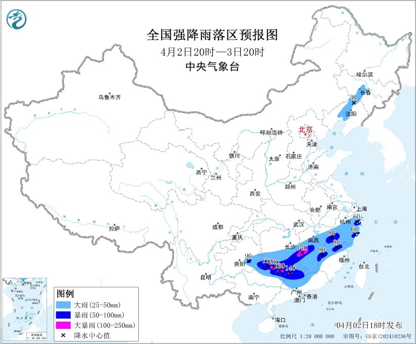 预计,4月2日20时至3日20时,贵州东南部、江南东部和南部、华南北部以及辽宁中部、吉林中部等地部分地区有大到暴雨,其中,湖南东部和南部、江西中部、广西东北部、广东西北部等地局地有大暴雨(100~160毫米)。上述部分地区伴有短时强降水(最大小时降雨量20~40毫米,局地可超过50毫米),局地有雷暴大风等强对流天气。此外,内蒙古东部、黑龙江中部、吉林西部等地有大到暴雪或雨夹雪。