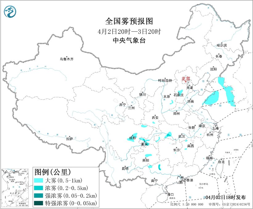 中央气象台4月2日18时继续发布大雾黄色预警:
