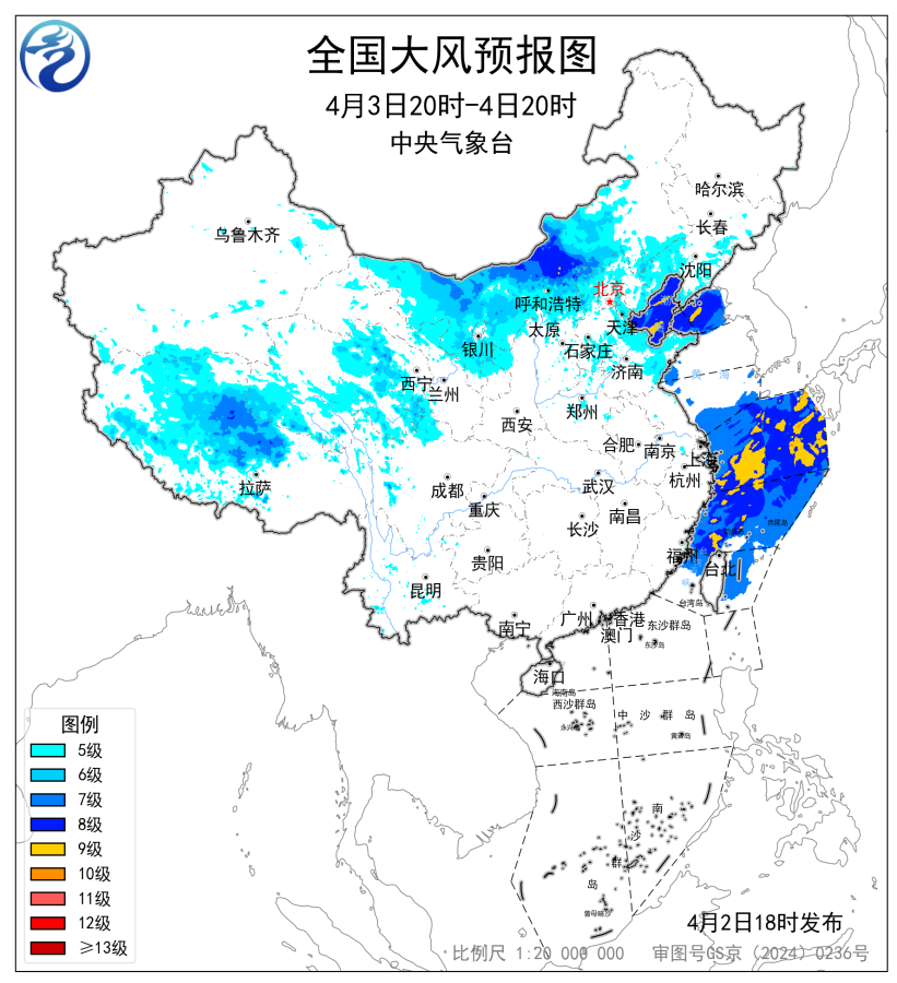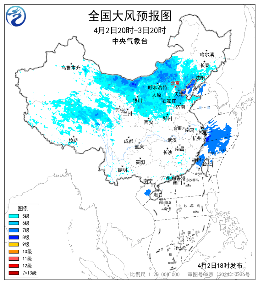 预计,4月2日20时至3日20时,受蒙古气旋影响,内蒙古中西部、甘肃西部、宁夏、陕西中北部、山西大部、河北、北京、天津、河南北部、山东北部、辽宁大部等地部分地区有5~7级大风,阵风8~10级。受冷空气和对流共同作用影响,河北东部、天津、辽宁西部、山东北部、广西东部、广东北部等地局地有10~11级雷暴大风。渤海、渤海海峡、黄海北部部分海域、东海大部海域、台湾海峡、台湾以东洋面将有7~8级、阵风9级的大风。