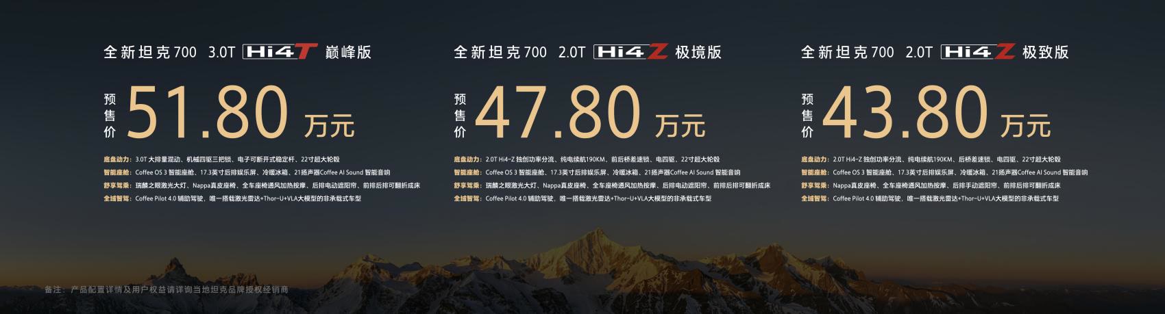 3月30日,全新坦克700正式开启预售,新车推出3.0T Hi4-T、2.0T Hi4-Z两大动力版本共3款车型,官方预售价43.80万元—51.80万元。作为坦克品牌向上的战略车型,全新坦克700定位“全域豪华SUV新旗舰”,以长城汽车全栈自研核心技术为底,满足从商务通勤、家庭出行到长途穿越以及极限越野的全场景需求。