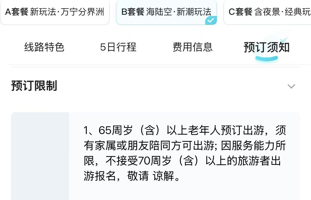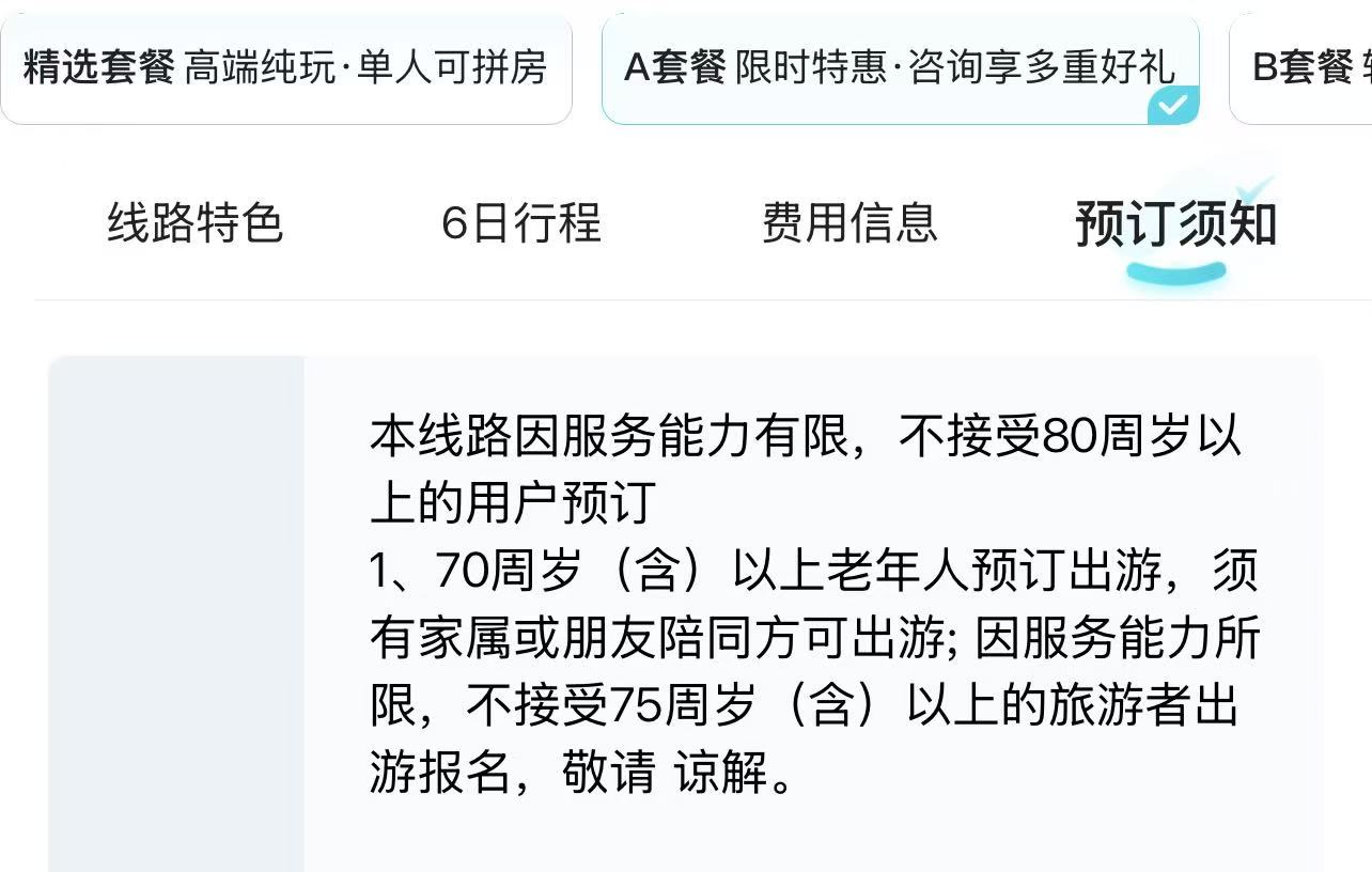 记者查询发现,不少国内游或出境游产品均有年龄限制。大部分产品明确注明“不为80岁以上老人提供服务”,部分产品则将年龄门槛降至75岁。如某云南8日游和贵州6日游两款产品,预订须知均明确不接待75岁以上老人,70岁以上老人需有成年人陪同;某桂林、阳朔4日游产品,不接待80岁以上老人,70岁以上老人须签订健康证明,且需家属或朋友陪同。某德法意瑞10日游产品页面显示,不接待80岁以上老人,75岁以上老人需有家属或朋友陪同,记者进一步咨询得知,65岁以上老人还需购买200元左右的大额旅游意外险。