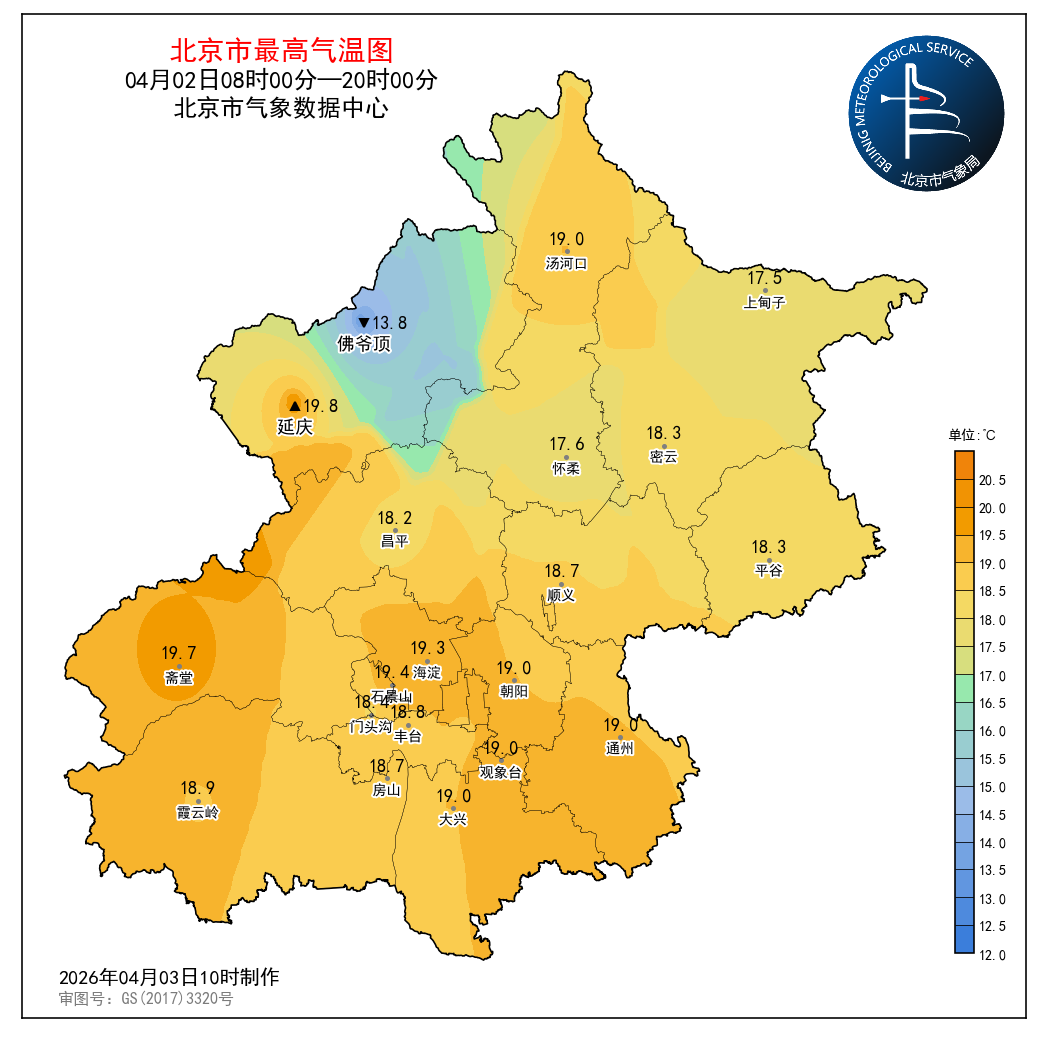 4月2日08时至2日20时,观象台最高气温19.0℃(16:01);
